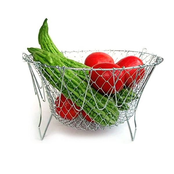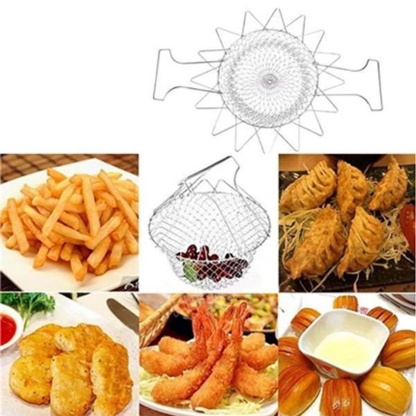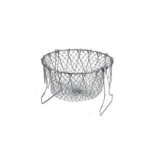 Chef Basket är gjord av rostfritt stål och har ett värmeskyddat handtag som skyddar dig mot brännskador. Den är hopfällbar och enkel att förvara, men ändå tillräckligt mångsidig för att användas till kokning, fritering, ångning och silning.